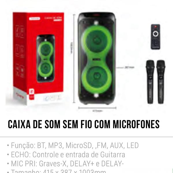 CAIXA DE SOM SEM FIO COM MICROFONES • Tamanho: 415 x 387 x 1003mm • Potência: 225W x 2